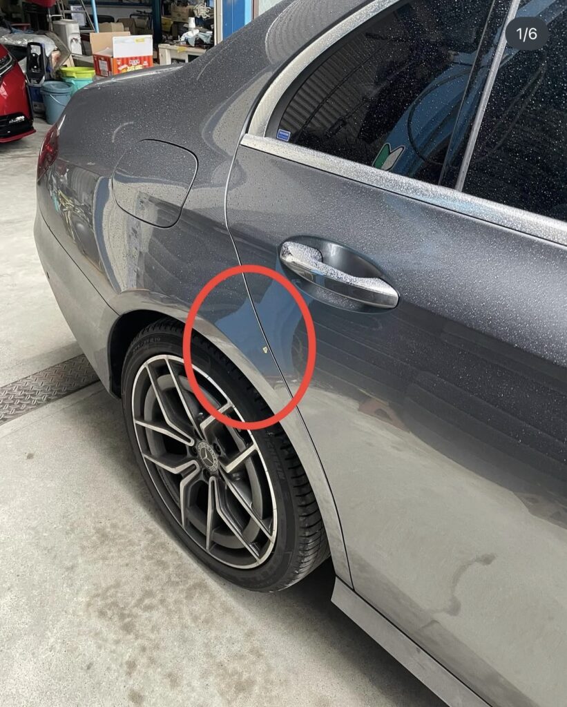 ベンツ Eクラスに凹み右リアフェンダー凹み板金塗装で数日預ける前に!神戸のデントリペアなら数時間で凹み解消ベンツGLCのドアパンチ凹み